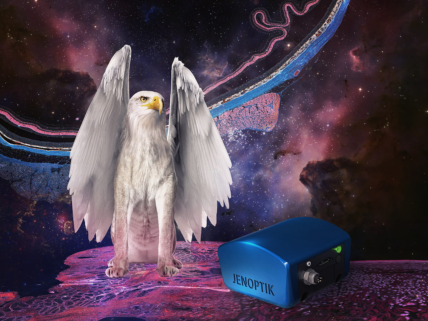 The passion to bring the hidden into the light is inherent in both the users of Jenoptik's microscope cameras and that fantastic being called GRYPHAX. With the joint mission to explore unknown galaxies of the micro universe, the GRYPHAX accompanies the curious people, the researchers, the teachers and the innovators on their daily journey of discovery.